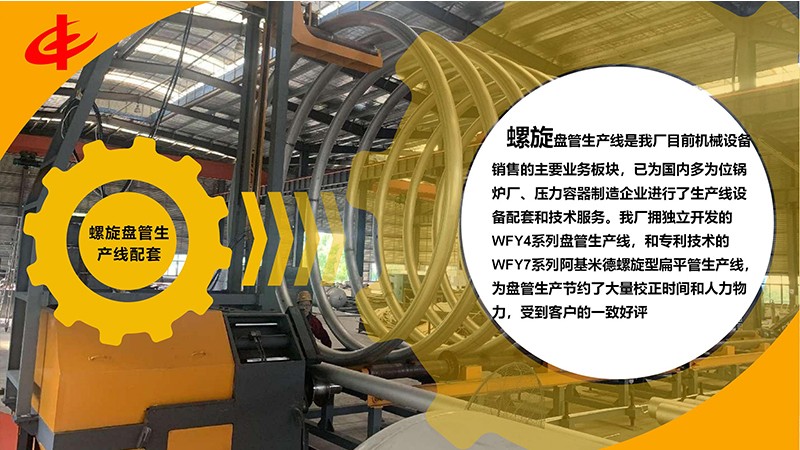 螺旋盤管生產(chǎn)線是我廠目前機械設備銷售的主要業(yè)務板塊,已為國內(nèi)多為位鍋爐廠、壓力容器制造企業(yè)進行了生產(chǎn)線設備配套和技術服務。我廠擁獨立開發(fā)的WFY4系列盤管生產(chǎn)線,和擁有專利技術的WFY7系列阿基米德螺旋型扁平管生產(chǎn)線,為盤管生產(chǎn)節(jié)約了大量校正時間和人力物力,受到客戶的一致好評。